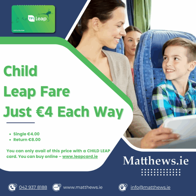 Matthews.ie introducing the Child Leap Fare Just €4 Each Way Matthews.ie are delighted to announce a great value travel option for families this summer: the Child Leap Card fare is…